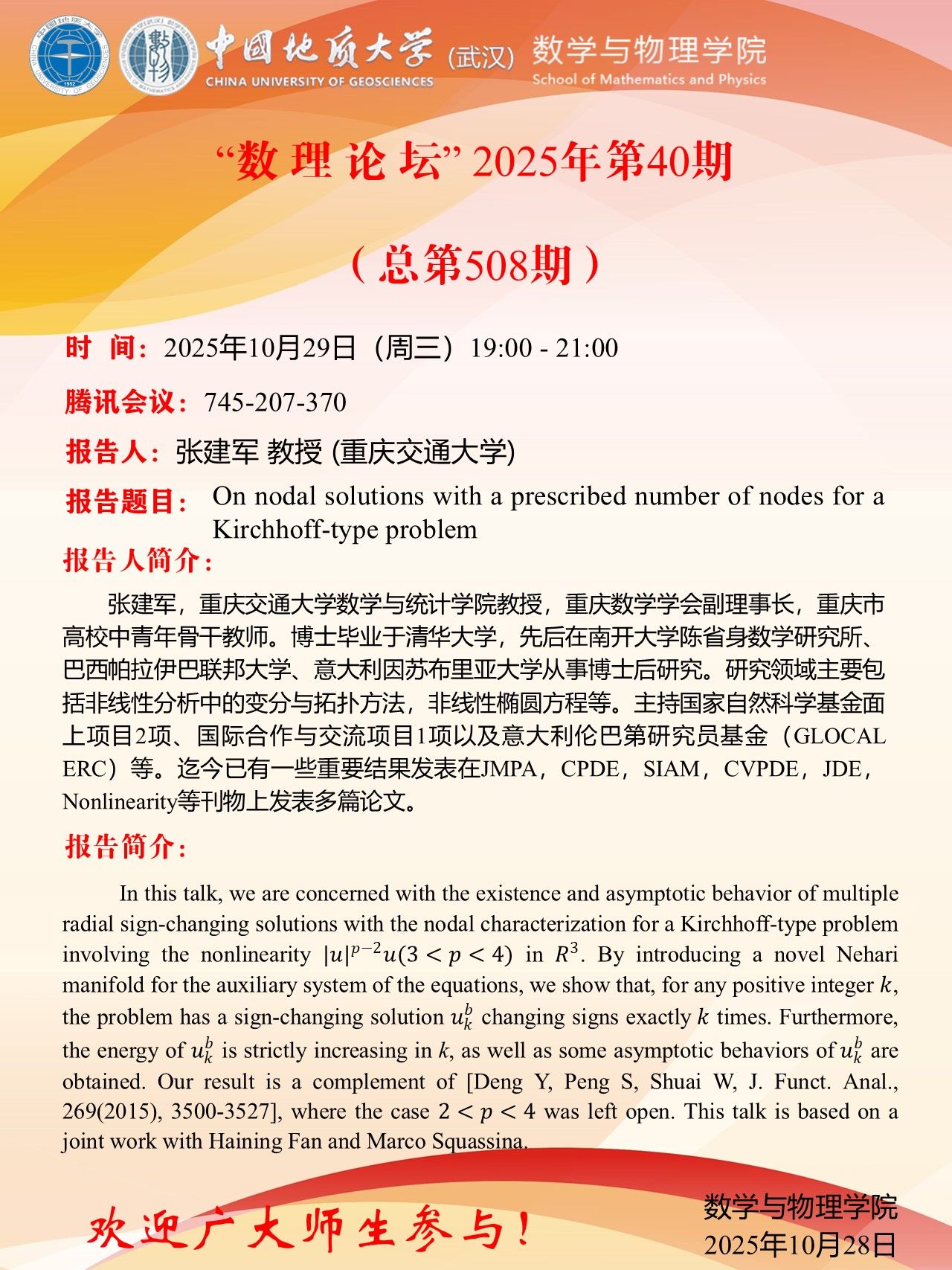 2025年10月29日张建军教授学术讲座:On nodal solutions with a prescribed number of nodes for a Kirchhoff-type problem
